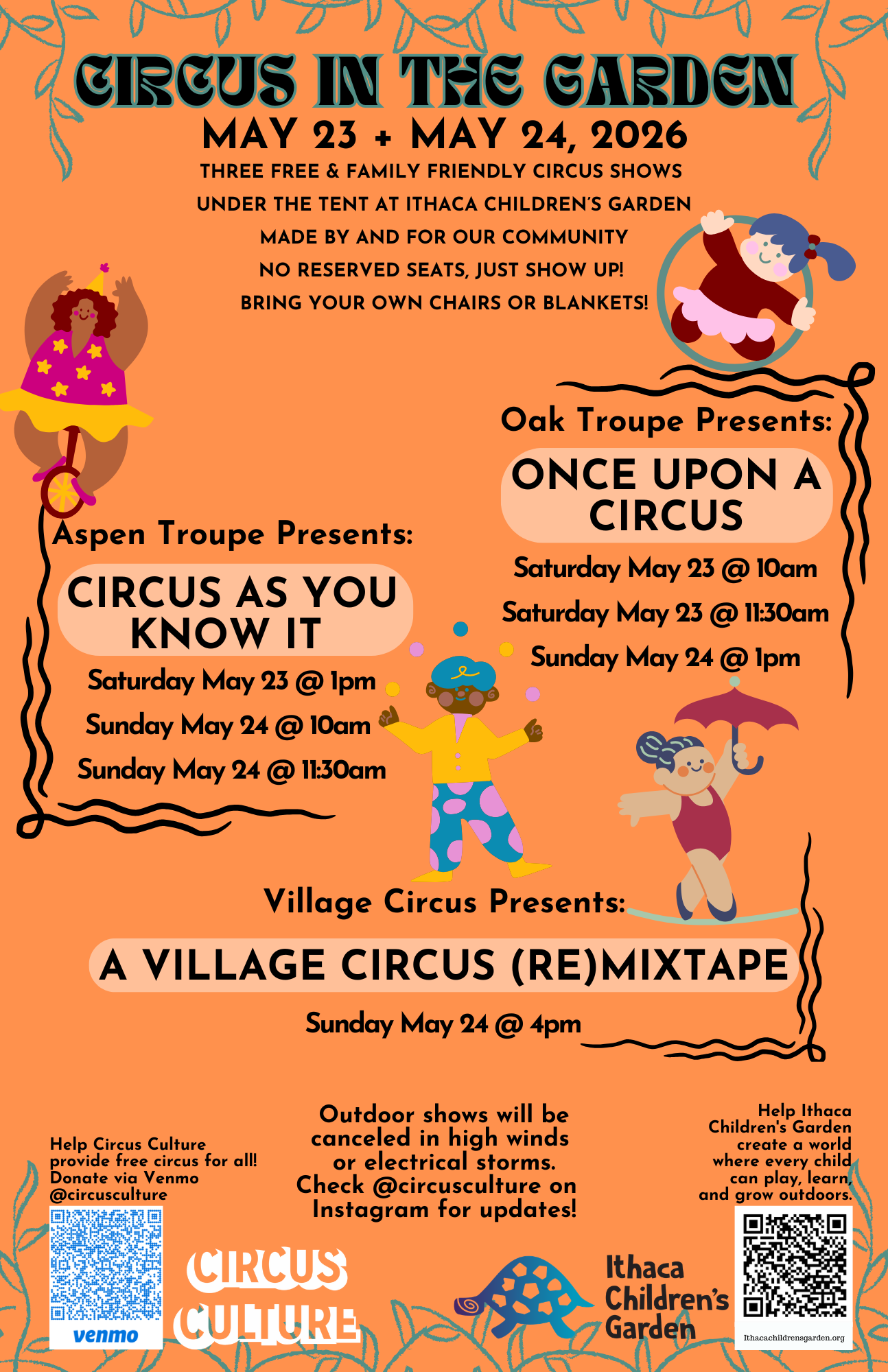 Save the date! Our beloved Circus in the Garden shows at the Ithaca Children’s Garden will take place the weekend of May 23/24.